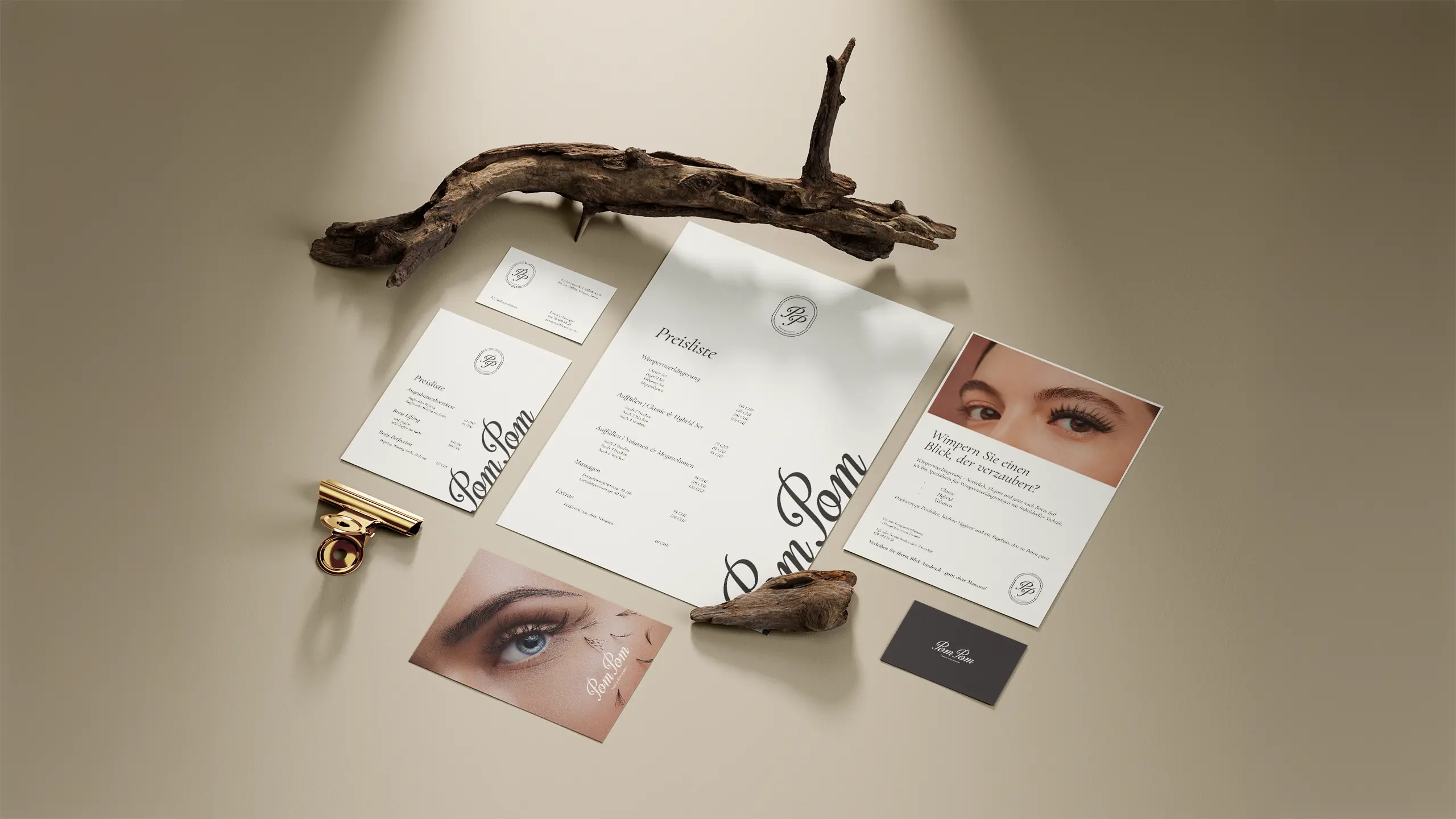 Este proyecto nace de la necesidad de fusionar la delicadeza del sector estético con una identidad visual robusta y sofisticada. Para Pom Pom - Beauty & Cosmetics, se desarrolló un sistema gráfico basado en la elegancia clásica, utilizando una tipografía script de trazos fluidos que evoca la precisión y el detalle de los tratamientos de pestañas y cuidado facial.